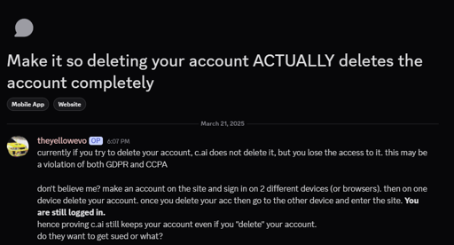 arrow-up177arrow-down1imagecharacter.ai does not actually delete any accounts. If you try to do it, you lose the access to the account, but the account is still stored in the sitelemmy.mlN00b22@lemmy.mlEnglish · 9 months agomessage-square12linkfedilink