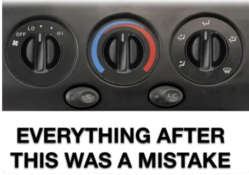 - I almost agree with this, but I prefer just one more advancement over this: the thermostat kind. I like to just set the temperature so I don’t have to keep adjusting it. - Nothing fancy, no touchscreen bs, just simple knobs. I was perfectly happy with the thermostat feature in my old 1997 Pontiac Grand Prix GT. - My new car is a 2025 model, but it’s an Indian made Japanese Kei car so the interior is super basic. and it has large, infinitely spinning knobs for temperature and fan strength, and a digital temperature readout. I really like them. - When the temp was cold in the morning but now it’s hot, I spin those dials like wheel of fortune to the left and immediately set the AC to cold and fast. No repeated button presses. - The only downside is that it doesn’t have one of those knobs for music volume. - Not only do those knobs sound awesome to use, but I could see them being cheaper and more reliable as well. - Instead of being mechanically connected to whatever custom parts to direct air flow, it can just be an off the shelf encoder sending a signal to a processor that already exists.