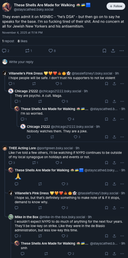 The one about the cops is complete nonsense especially because if you have ever been to a synagogue you know that you have to pay the cops to be there for security, like they dont do it out of the kindness of their heart or concern for anyone lol. Its an add on service that the cop gets personally paid for. So the cops will be there regardless of a Zohran victory
