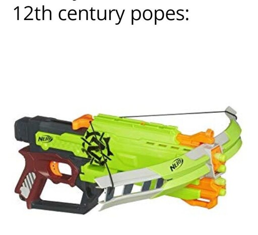 Explanation: In the medieval period, a surprising amount of the Church’s moral outrage was directed at the crossbow (and, to a lesser degree, the bow), to the point where one 12th century Pope, Innocent II, outright banned the crossbow and archery in wars between Christians! (he was ignored, naturally)