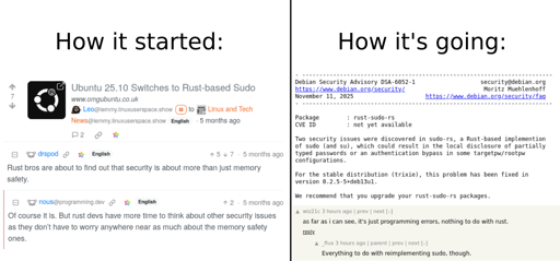 For sudo/coreutils, I feel like those projects are more ‘settled’ and unlikely to need a lot of ongoing work, so the risk/benefit analysis cuts a different way.