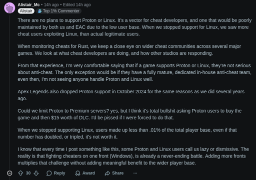 arrow-up1140arrow-down1imageThe COO at Facepunch Studios (developers of Rust) commented on Rust Linux support, and it might never be supported again in the foreseeable futurelemmy.mlmr_MADAFAKA@lemmy.ml to Linux Gaming@lemmy.worldEnglish · 1 month agomessage-square59linkfedilinkfile-text