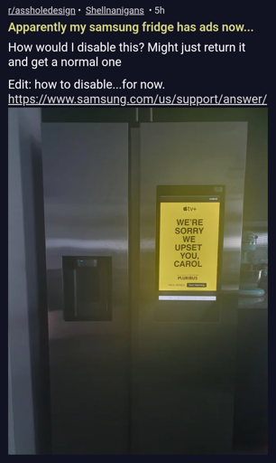 Why on earth would anybody buy a fridge with a screen? Why does everything have to be screens? Why is it all one big mobile phone nowadays? Can’t we just not be staring gormlessly into a flashing screen for two fucking seconds for a fucking change??? I just got back inside from a run and now I’m going outside again for a walk in the dark and the rain because there is an entire world out there that isn’t an algorithmically driven advertising funnel trying to shove more bullshit down our eager eyes, ears, and throats.