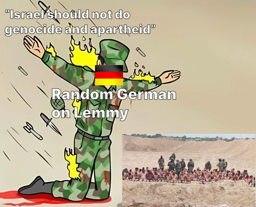 You can and should condemn apartheid and genocide; but who is the “random German on Lemmy”? Are Germans bad? Is there a specific user you’re referring to, or are you casting a wide net and making “Germans” an outgroup? Maybe I don’t get it, but it looks like you’re condemning one thing at the expense of another… and that’s unnecessarily divisive to me if your only goal was to bring something into the foreground of conversation. Can you explain what your meme means?