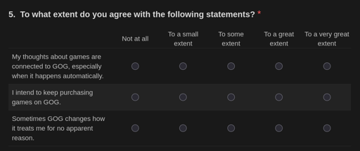 “I feel I have a close relationship with GOG.” followed by "I feel that I am personally connected to GOG. "