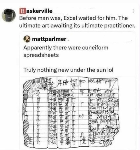 minus-squarelugal@lemmy.dbzer0.comlinkfedilinkarrow-up67·14 days agoScript itself wasn’t invented for poetry or stories or history but for bookkeeping. Who owns how much and who own whom what amount? Let’s write it down.