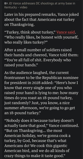 sempersigh [he/him]@hexbear.net to Chapotraphouse@hexbear.netEnglish · 4 months agoAfter talking about the national guard shooting JD Vance decided to have a normal one about turkeys cw : meathexbear.netimagemessage-square46linkfedilinkarrow-up197arrow-down10