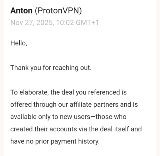 This is why Mullvad doesn’t do deals. The price is the same, regardless of whether you get a month or 5 years at once. Nobody needs to be pissed off by missing out on a deal someone else is getting.