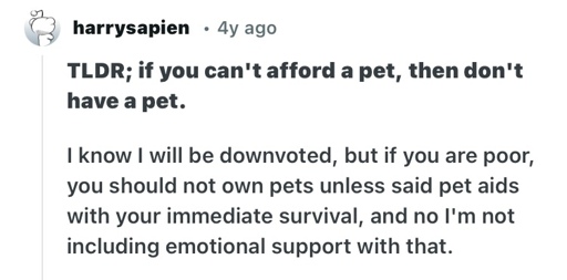 Well yeah, of course she would have been better off. But that also most likely wasn’t going to happen. Rich assholes buy designer dogs for thousands of dollars from breeders, they don’t sully their hands with poor dogs from poor people. Most of the time if you’re poor and have a dog, that dog’s only alternatives are an overcrowded and underfunded shelter or the literal streets. She certainly wouldn’t have been any better off there.