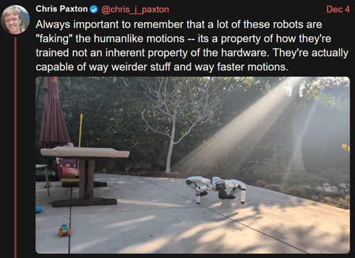 Always important to remember that a lot of these robots are “faking” the humanlike motions – its a property of how they’re trained not an inherent property of the hardware. They’re actually capable of way weirder stuff and way faster motions.