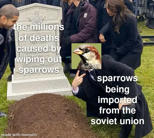 Afterwards, China would resort to importing sparrows from the Soviet Union to unfuck their ecosystem.