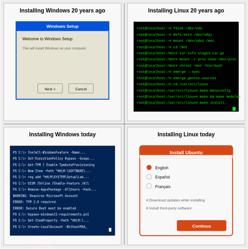 Panel 2: “Installing Linux 20 years ago” screenshot of a busy command line