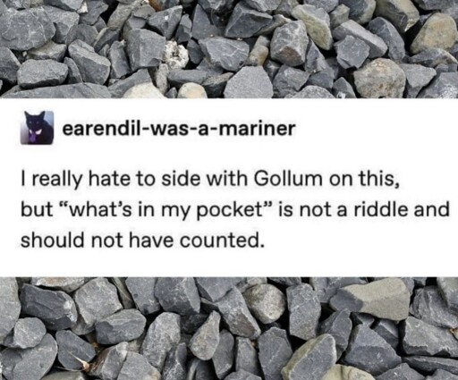 Bilbo seeing what had happened and having nothing better to ask stuck to his question, “What have I got in my pocket?” he said louder.