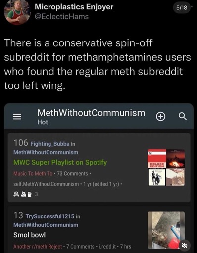 Actually, it’s stupider, the original meth subreddit made rules against posting images of drug use because reddit admins were breathing down their necks, some of the userbase deemed that censorship to be communist because something something 1984. Except, obviously, it was done because advertisers don’t want to advertise next to drug use. So it’s literally classic Americans calling the negative consequences of capitalism communism