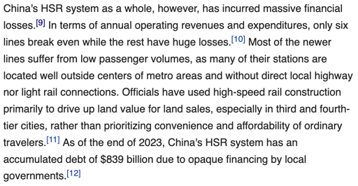 It really should be sovereign spending tbf. Like, America’s bloated healthcare and military is Federal spending (ofc, no one cares about ‘losses’ for military since you know, it’s the military). When you use non-sovereign entities, you are borrowing from commercial banks (even if state owned), commercial banks give out loans which are supposed to be paid back so the sovereign (central bank + ministry of finance) don’t have to recapitalize it (which raises fiscal deficits which the central gov don’t like due to ‘sound’ finance). Obviously, HSR has a lot of utility however the financing debt should be transferred to the Central Govt, I don’t care about profitability in money terms, many of the good parts of HSR don’t show up on balance sheets. i think they should stop using accounting trickery and have it be an item on Central Govt budget, although the reason they do it this way is to make national debt and fiscal deficit appear lower (for silly reasons).