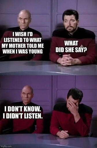 “It’s times like this, when I’m trapped in a Vogon airlock with a man from Betelguese, and about to die of asphixiation in deep space, that I really wish I’d listened to what my mother said to me when I was young” Full quote is a bit long for the meme…