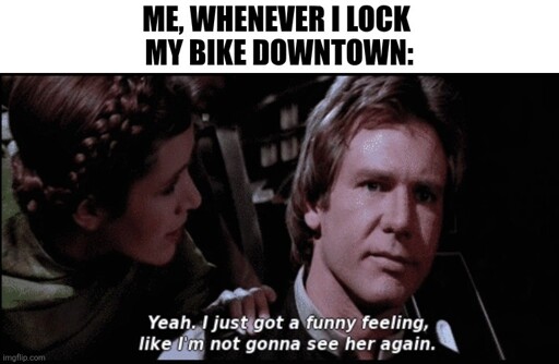Lived too far to e-bike to work but would bring it with me to do around-town errands on breaks at work. Every time I had to park it outside to run into a store, I felt exactly like the meme. The battery alone was $700 sitting out in the open.