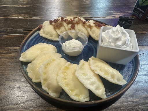 The cream for the sweet pierogis isn’t exactly whipped cream. I can’t quite identify it, but I think it is some kind of sweetened sour cream (this is something I’ve have before) that’s been whipped to bee less dense than normal sour cream.