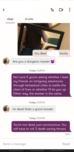 That’s actually also fine, because that’s very easy to feel out when talking to someone, IME. I was more trying to filter out the type of person who doesn’t know anything about BDSM but would enthusiastically agree to take control without doing any work to understand how to do things safely. I’m tired of being endangered because someone didn’t want to listen to me explaining that you need to avoid the kidneys in impact play or that you can’t put the entire body weight on an unsupported suspended strappado. I’m not good at sorting that type of person out in my dating life, unfortunately, but I can spot them immediately when they dm/talk about dming.