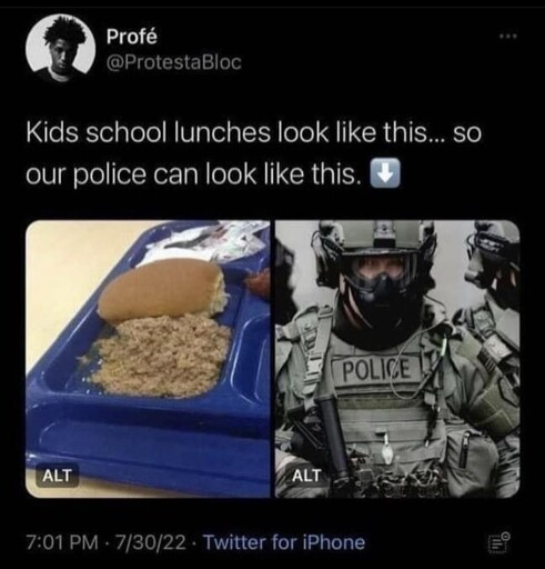 except the police have the mcdonalds menu photo vs the actual burger thing going on and the money is actually going to ai and war crimes or something