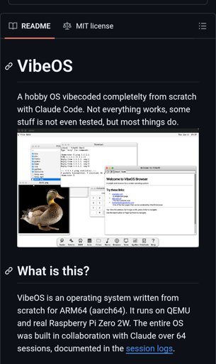minus-squarehayvan@piefed.worldlinkfedilinkEnglisharrow-up15·2 days agoThat one is funny. And somewhat interesting project to see limits of LLMs. There is another project called vibeos at https://vibeos.sh/ which is, more disgusting than anything I guess.