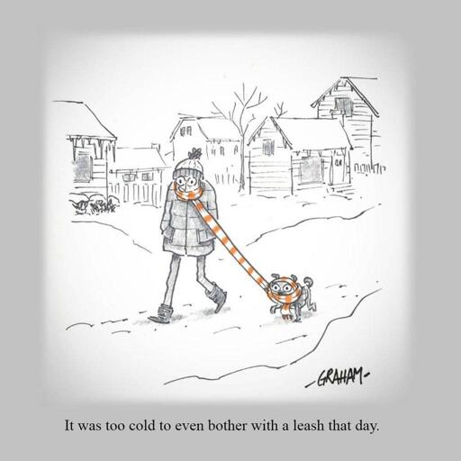 Alt Text: A cartoon illustration of a person and their pug walking outside in the winter, using a scarf wrapped around both their heads as a leash. Caption reads “It was too cold to even bother with a leash that day.”