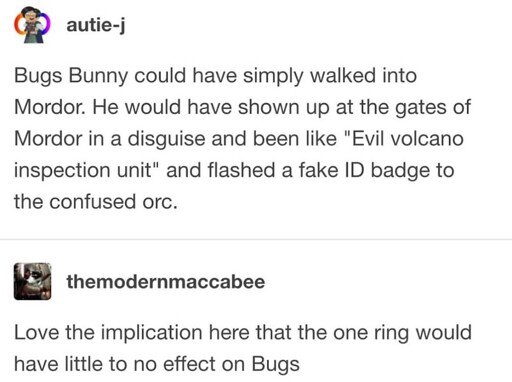 TRUE! if anything, bugs and daffy are merry and pippin. or sauruman and grima if we’re getting spicy