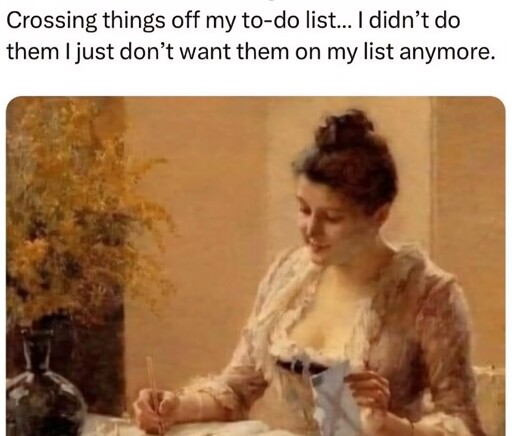 minus-squareMidsizedSedan@lemmy.worldlinkfedilinkEnglisharrow-up7·16 days agoMake it look like you making progress by adding easy items. Make to do list. Check