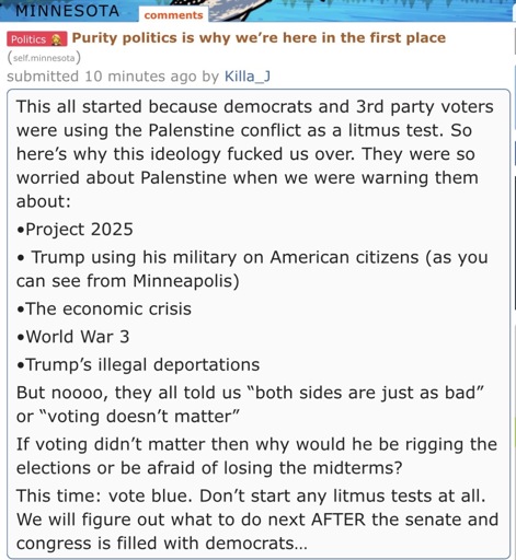 Hey I just thought of a new litmus test called “the shit you support abroad says a lot about the shit you’ll support at home” so go on supporting a genocide then, democrats