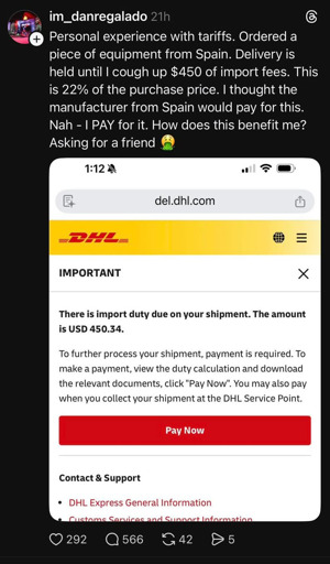 The propaganda on tariffs is that foreign imports are bad and domestic manufacturing is good. And plenty of the conservative community accepts this, because they aren’t trying to buy direct from overseas. This guy is an outlier - a MAGA dude who is attempting to import a $2000 widget from Spain for whatever reason - and not representative of the average American voter.