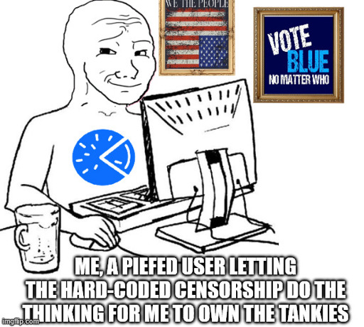 @AmazingWizard@lemmy.ml comrade, I think this post could use your recently linked comment as a top-level, just to help show people here what OP is talking about regarding PieFed hard-coded censorship.