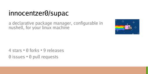 Supac is a declarative package manager written in Rust fully scriptable in nushell. It’s meant to make it easy to use the native package managers in existing distros without going through the associated headaches of using Nix, while maintaining the ergonomics of structured data in nushell.