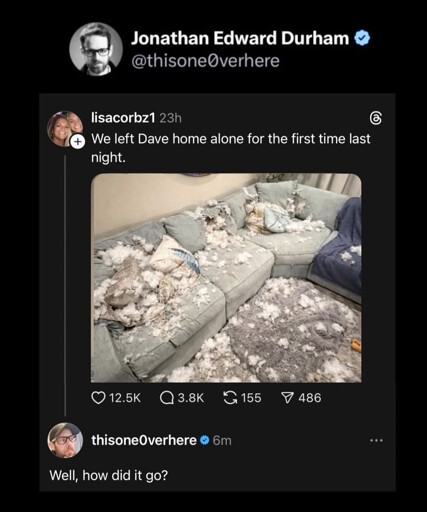 minus-squarezxqwas@lemmy.worldlinkfedilinkEnglisharrow-up5·9 days agoThree shoes from different pairs. Other dog nibbled on the wallpaper in 3 rooms and somehow ate a hole in the floor in one.