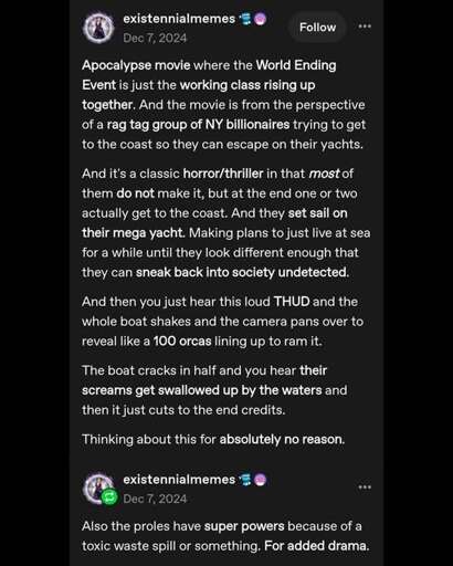 minus-squarehuf [he/him]@hexbear.netlinkfedilinkEnglisharrow-up18·2 months agoand their beloved yacht captain employee just sighs, poisons them and cries while holding their heads as they die.