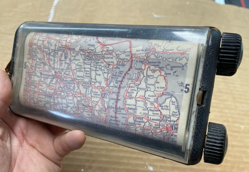 For anyone wondering what the heck this thing is, it’s called a roll chart. Usually these are loaded with turn-by-turn instructions for rally racing or similar, but as you can see you can also stick a map in one.
