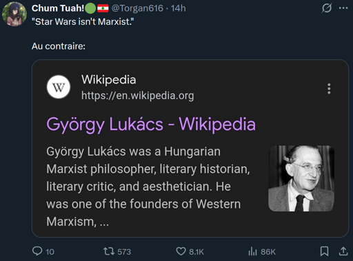 minus-squareherseycokguzelolacak@lemmy.mllinkfedilinkarrow-up5·2 months agoDidn’t George Lucas say that the original trilogy is an analogy for the Vietnam War, and the Rebel Alliance are the Vietcong?