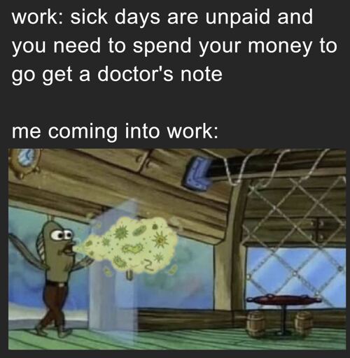 My coworker with sick days: I don’t want to waste them, I want to go on a month vacation so I’m coming in sick and getting you all sick.