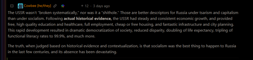 Numerous points here are untrue. The USSR’s economic growth was anything but consistent or steady, the educational and healthcare standards for the masses were subpar and the elite afforded special treatment precisely because of that reason, full employment was a myth, homelessness was a major issue, infrastructure in the SovUnion was mega-fucked, and city planning was disastrous because of the weight of the ideology and bureaucracy demanding results without being able to deliver resources.