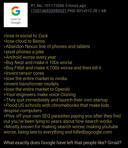 arrow-up11.18Karrow-down1imageAnon thinks about Googleprogramming.devstarman@programming.dev to > Greentext@lemmy.mlEnglish · 2 years agomessage-square346linkfedilink