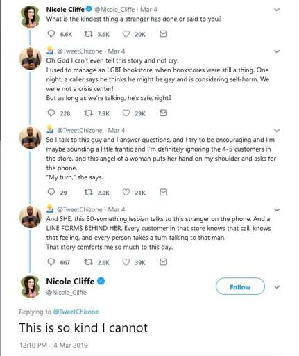 You know, I’d never thought about doing something like that. Tbh, that seems more helpful than most things; because you know where the person you’re talking to is, and that you can go and see them in person. Like, you really shouldn’t do that do a store clerk, that’s not what they’re being paid for; but at the same time, if I was in that position then I’d absolutely put my job on the line and take the time to talk and comfort them.