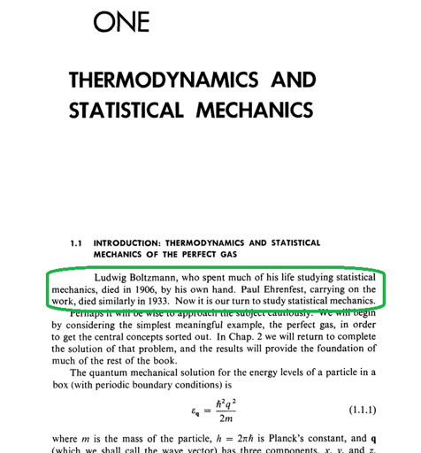 1.1 Introduction: Thermodynamics and Statistical Mechanics of the Perfect Gas. Ludwig Boltzmann, who spent much of his life studying statistical mechanics, died in 1906, by his own hand. Paul Ehrenfest, carrying on the work, died similarly in 1933. Now it is our turn to study statistical mechanics.