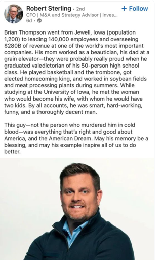 Someone else also pointed out there is exactly one photo being passed around of Brian Thompson. You would think they would find more family oriented photos to push the narrative