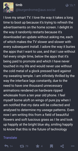I love my smart TV. I love the way it takes a long time to boot up because it’s trying to refresh the advertisements on the home screen. I delight in the way it randomly restarts because it’s downloaded an update without asking me, each of which makes the TV slower and slower with every subsequent install. I adore the way it buries the apps that I want to use, and that I use without fail every single time, below the apps that it’s being paid to promote and which I have never touched in my life and would never use without the cold metal of a glock pressed hard against my sweating temple. I am infinitely thrilled by the way the interface lags constantly, due to the need to have one thousand unnecessary animations rendered on hardware ripped wholesale from a ten year old phone. I feel myself borne aloft on wings of pure joy when I am notified that my data will be collected and analysed to determine my usage patterns. Even now I am writing this from a field of beautiful flowers and soft luscious grass as I lie and look up happily at the bright blue sky, smiling happily to know that this is the future of technology