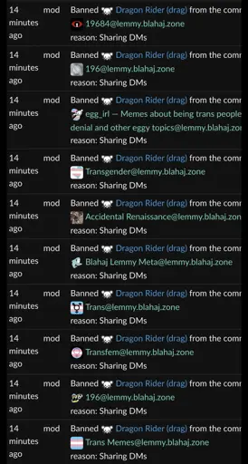 Dragon Rider (drag) being banned from the following communities for sharing DMs:
