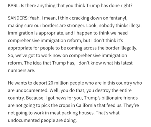 I haven’t seen the clip, but with no other context there is no reason to think that Sanders is being positive about the exploitation that undocumented people suffer doing brutal work (in particular in food production). He is just stating something that’s actually true - the exploitation of undocumented people is the foundation of the American food system. And if they were expelled en masse, then this system will be in trouble.