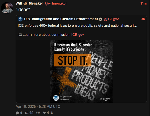 damn why did i think customs and border was a separate thingy, oh well (in my head it was like immigration something enforcement)Because there’s Customs and Border Protection and also Immigration and Customs Enforcement, two distinct agencies with an unclear difference