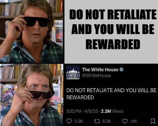 hellinkilla [they/them, they/them]@hexbear.net to El Chisme@hexbear.netEnglish · 8 months ago@WhiteHouse Apr 9 "DO NOT RETALIATE AND YOU WILL BE REWARDED"lemmy.worldexternal-linkmessage-square1linkfedilinkarrow-up129arrow-down10file-text