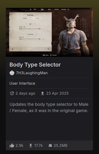 It’s not surprising to me really given that gamers have thrown fits over past games using types instead of ‘female’ or ‘male’ but I guess I just can’t get over how fucking stupid it is to care so much that you download a mod that reverts the text in a character creation menu. The slightest change in language in order to be more welcoming to other players is treated as the downfall of society by these people.