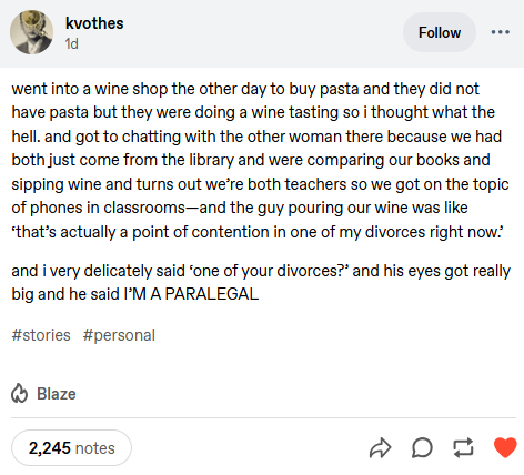 [I] went into a wine shop the other day to buy pasta and they did not have pasta[,] but they were doing a wine tasting[,] so i thought what the hell. [A]nd [I] got to chatting with the other woman there[,] because we had both just come from the library and were comparing our books and sipping wine and[,] turns out[,] we’re both teachers[,] so we got on the topic of phones in classrooms—and the guy pouring our wine was like[:] ‘that’s actually a point of contention in one of my divorces right now’.