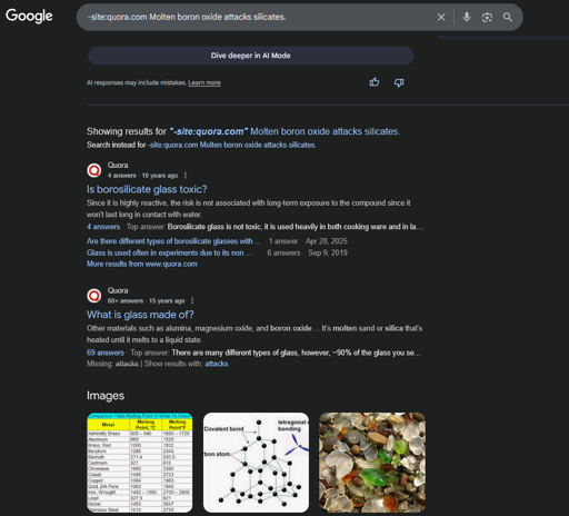It seems to me like the OP’s specificand (not x)usage ofsite:domain.tldis the reason why it isn’t working. While the negation prefix (-) does work for tokens/words (e.g.mercury -freddie), it’s probably transformingsiteinto a token not to be included in the results (i.e. "any results that don’t contain the word “site”) which, disconnected from the rest of the sentence (:quora.com), turns the latter into part of what the results should include, so the query ends up being something like:Filter all the indexed Web results where its contents don’t include the word “site”, possibly do include “quora.com”, possibly do include “Molten”, possibly do include “boron”, possibly do include “oxide”, possibly do include “attacks”, possibly do include “silicates”